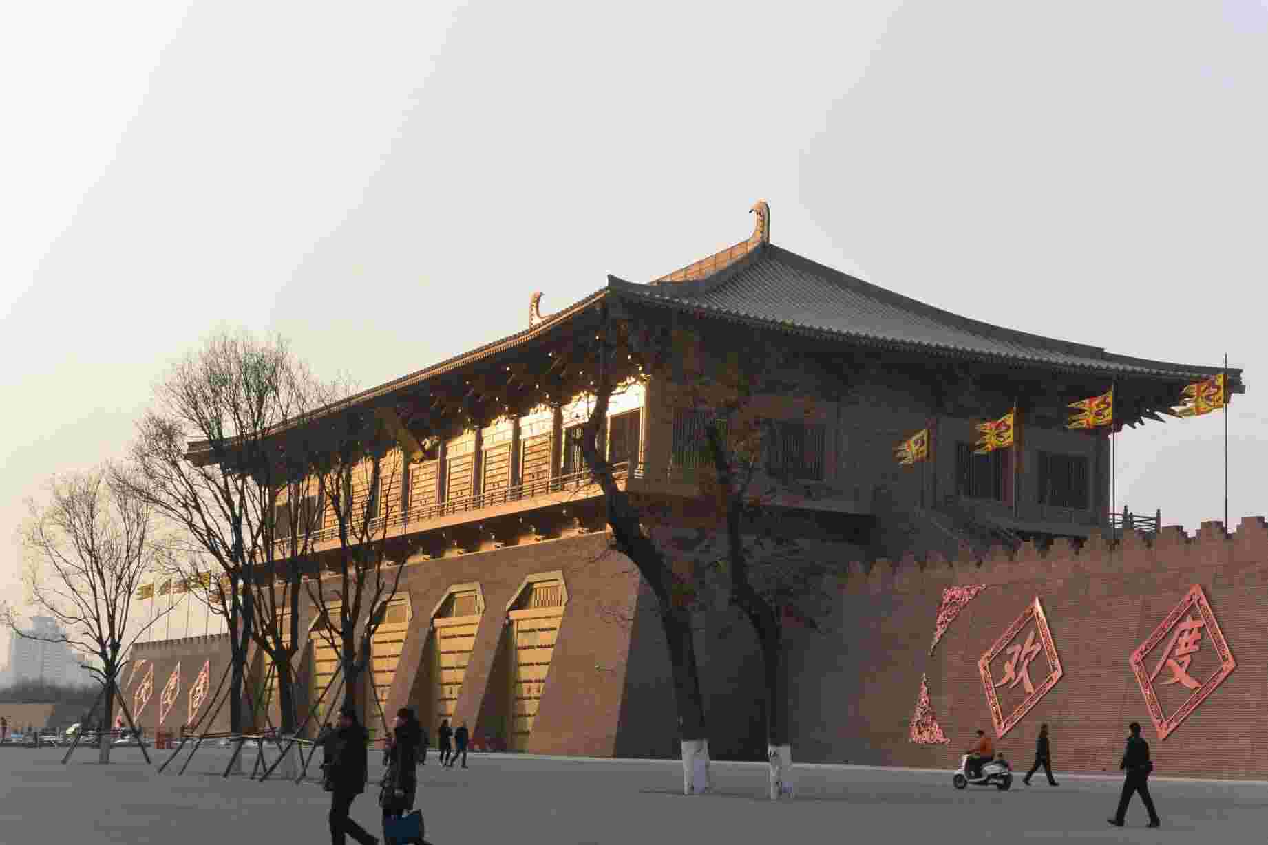 唐代时,大明宫是高宗朝的政治中心,目前已成为大明宫遗址公园。丹凤门是大明宫的正门,地位与太极宫的承天门相同,都属宫城正门,从门道宽8.5 米可知丹凤门地位之尊、等格之高、规模之大,均居都城门阙之首。这座城门建于唐高宗年间,城墙上的丹凤楼与含元殿、宣政殿、紫宸殿相望,形成大明宫的中轴线,古代的御驾便从此通过,凡登基、改元、大赦等大事都于此举行。