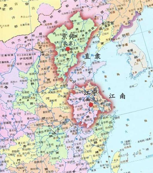 1368年,朱元璋建立明朝以后,在元朝行省的基础上,进一步调整完善。明朝拥有南北两个都城,再加上情况特殊的凤阳府。最终,明朝形成了南北直隶与13个省的区划格局。在明朝统治时期,我国很多省份的大体区划轮廓已经成型,例如浙江省、福建省、山东省等等。北直隶包括了北京、天津、河北等地,南直隶则包括了上海、江苏、安徽等地。