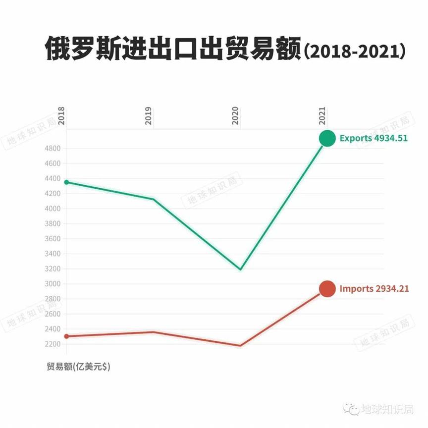 根据俄罗斯央行公布的数据,俄罗斯2021年的出口总额为4898亿美元,其中原油占到1102亿美元,石油类产品687亿美元,管道天然气542亿美元,液化天然气76亿美元。也就是说,能源合计占到俄罗斯出口的接近一半。