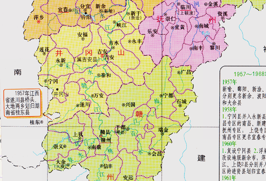 随着一系列重要项目的开始,我国对石油、钢铁、煤炭等各种资源的需求量越来越大。50年代初期,湖南、江西两省交界地区的测绘工作开始。随后,两省的区划调整陆续进行。湖南省桂东县的桥东乡、大地乡等13个乡镇,合计有200余个乡村,陆续划入了江西省遂川县管理。