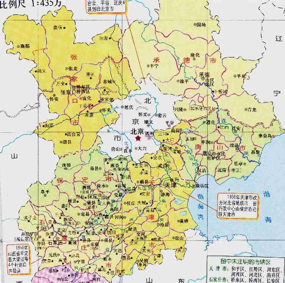 截至此时,河北省下辖了7个地级市,没有下辖专区。在这一时期,河北省的区划非常有意思。在五六十年代,我国的交通、通讯水平有限,一个地级市或者专区,管辖的县太多,反而会增加管理难度。因此,1961年,河北省陆续重新组建了石家庄专区、邯郸专区、邢台专区、张家口专区、承德专区、保定专区、唐山专区、天津专区、沧州专区等9个专区。