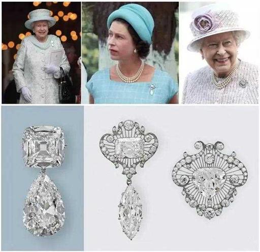 库利南钻石再次点亮了女王的珠宝箱。继1909年,最大的两颗库利南钻石被镶在英王的权杖和王冠中后,剩下的7颗做成了包括胸针、项链、耳环在内的饰品。这枚胸针便是由库利南Ⅲ号和库利南Ⅳ号组成这两颗钻石分别重94.4克拉和63.3克拉,是女王最珍贵的钻石胸针。