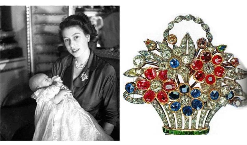 女王1947年和菲利普亲王结婚,婚后育有三子一女。1948年11月,他们的长子查尔斯王子降生,女王当妈妈了。女王的父亲乔治六世送给她一枚彩色花篮胸针,既是对女王的祝福,也是对外孙和英国王位未来继承人的降生表示欣慰。