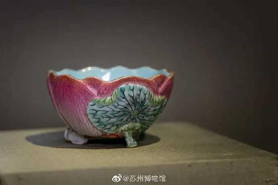 现藏于苏州博物馆的这件“粉彩绿里花形杯”,整个杯型参考荷花形态包裹,清灵婉约的淡淡釉色渲染,真如荷花盛放一般,如火如荼。