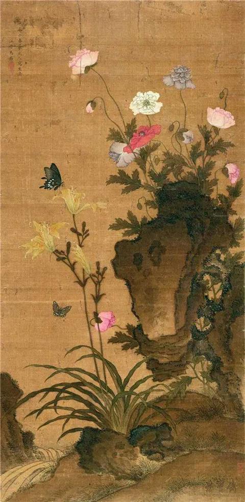 马荃生于书画世家,祖孙三代皆擅画。父亲马元驭为蒋廷锡幕客时,马荃就是蒋廷锡女儿蒋淑的老师,她有众多女弟子,皆为同乡闺秀,其中不乏摹马荃花鸟能乱真者。马荃的花鸟画一般设淡色,不蓊染,虽说是供人焚香清赏的一类作品,但画中气势充盈。那些柔弱的花草纤芽在她的笔致下无不生机盎然,《花蝶图》是一幅尺幅颇大的绢画,画面气韵闲逸,花势芬芳。图中罂粟与拳石形成鲜明的对比,一妖娆艳丽, 一厚重笃实,挺生于拳石旁的数株罂粟花,或怒放或含苞,色泽鲜湛,“盖用丹砂、胭脂、花青等合墨细细渲染十数遍”,遂使花容精气内含,而英光外发。牡丹碧桃,罂粟蕙兰流露出其家学的渊源,家族的气质以及马荃作为一女性性灵的“如花”风貌。
