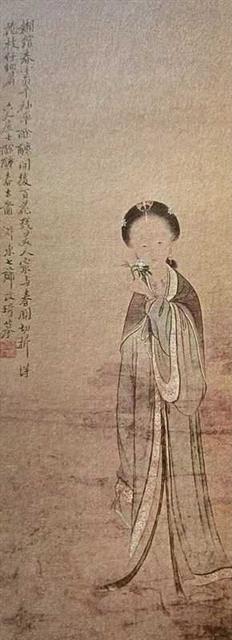 画中女子衫裙长禙,凝神静立,她微微颔首嗅着一束荼蘼花枝,仿佛若有所思。面部仅以细线勾勒,几只朱钗点缀在乌发之间,人物没有锦衣华服,却透出秀逸温雅的气质,虽有妙龄少妇的美态,却流露出凄凉惆怅的抑郁情绪。