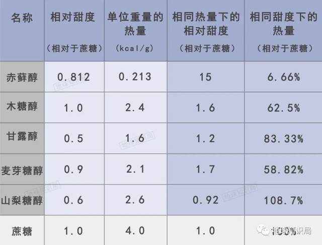 但是,糖醇类在热量上的表现是有区别的,如赤藓糖醇被认为是0kcal/g,木糖醇为2.5~3kcal/g(蔗糖一般为4kcal/g),算是一种低热量的甜味剂。