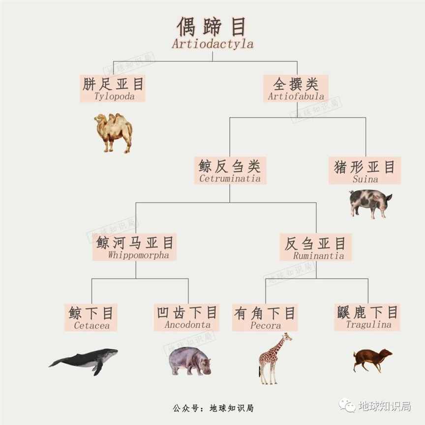 从中可以看到,猪属于偶蹄目,而我们熟悉偶蹄目动物还包括牛、羊、鹿、骆驼、羊驼,还有生活在海洋中的鲸豚。猪竟然跟这么一大群动物是亲戚。