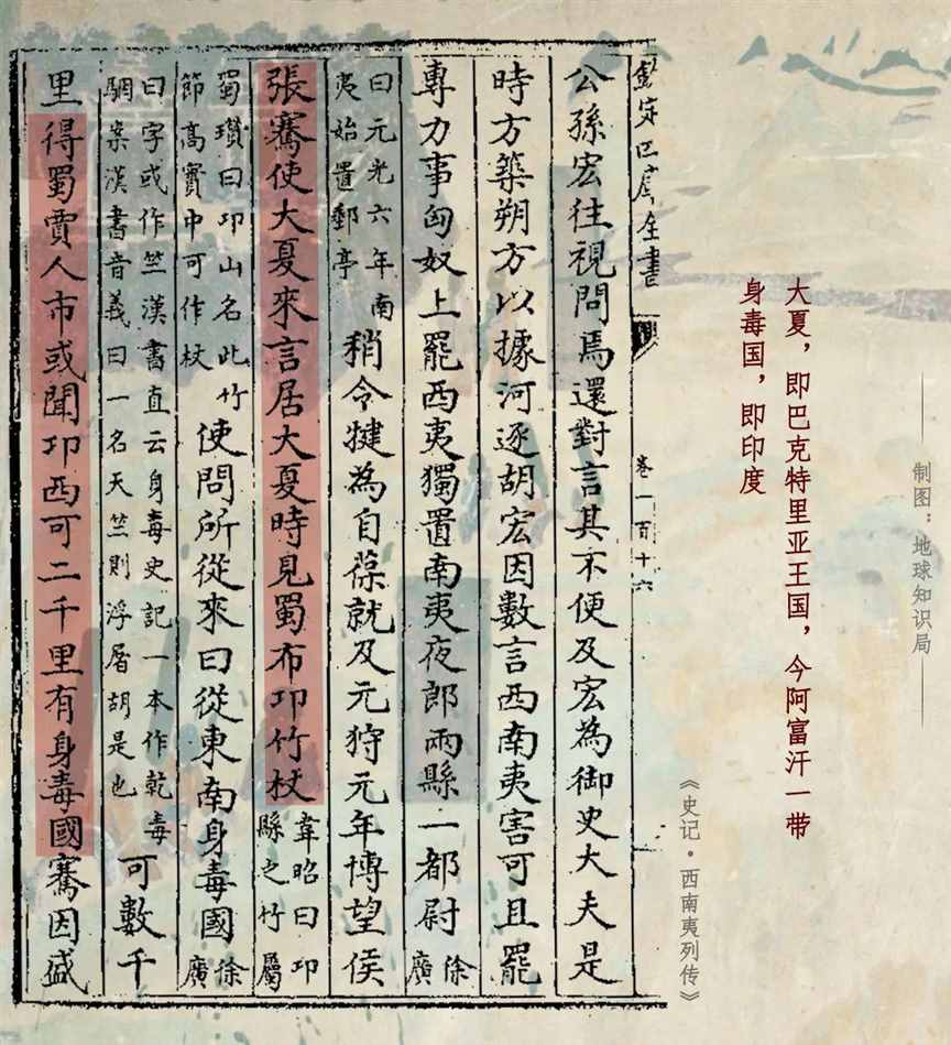 汉武帝时,张骞出使西域,在中亚大夏国发现了蜀地出产的邛竹杖和蜀布。这些东西是商人从古印度贩来的。