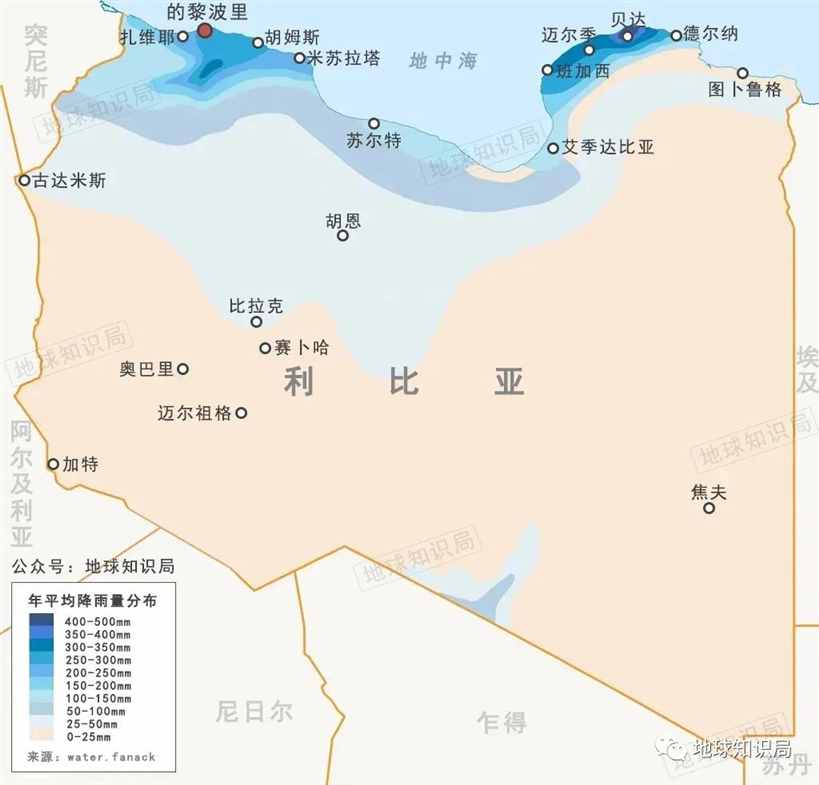 利比亚绝大部分地区属于热带沙漠气候,仅沿海少数地区是地中海气候,全国年降水量非常少。利比亚多年未经历这样的暴雨,更没有为这样的灾难做好准备。
