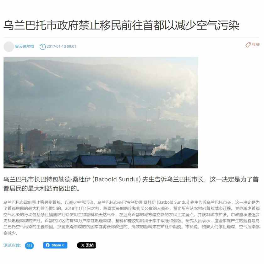 当年1月11日,时任总统的额总会见记者时通报了乌市空气污染问题。他指出,空气污染已成为一场真正的灾难,并补充说乌市是一座没有未来的城市。他用“灾区”来形容自己国家的首都,强调有必要从中疏散居民。