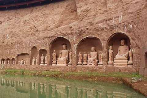 继续前行是“仙佛映月”景点,为景区八大主景之一,是广大信众礼佛的主要场所。为了保护不可再生的文物胜迹——摩崖石窟,该景点完全按照摩岩石窟的形制规格,等比复制了3个大佛龛,1个中型佛龛,18个小石窟。三尊大佛通高6米,身躯伟岸,神态庄严;中型龛为双观音立像,形象古朴,风格独特;小佛神态灵动,须眉如画。其下清澈的河水顺渠入莲花湖,如镜的水面倒映出天光云影、仙佛雕像——“佛潭映月”的美景得以重现,悠久精湛的摩崖造像艺术得以还原。善男信女皆在此虔诚祈祷,燃香化纸,表达心愿。