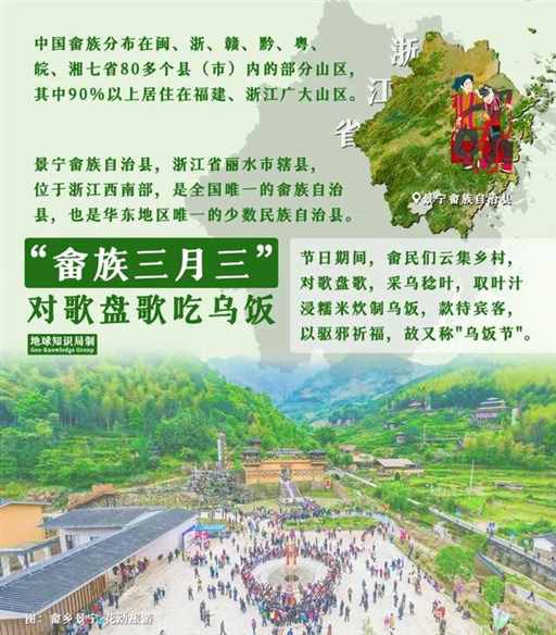 “畲(shē)族三月三”,又称“乌饭节”,有“三月三,吃乌饭”的传统习俗。节日期间,家家户户用乌稔树叶汁液泡糯米、蒸乌饭,并互赠,也含有祝祷丰年之意。