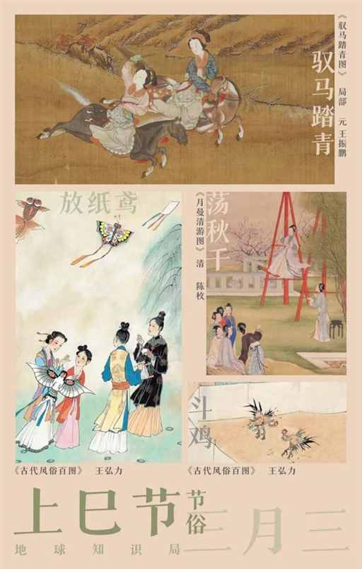 同时,因为寒食、清明节日假期的延长,三个节日逐渐相连。唐代王维以《寒食城东即事》为题作诗,内容却是“少年分日作遨游,不用清明兼上巳”,可见当时三个节日已“合而为一”。