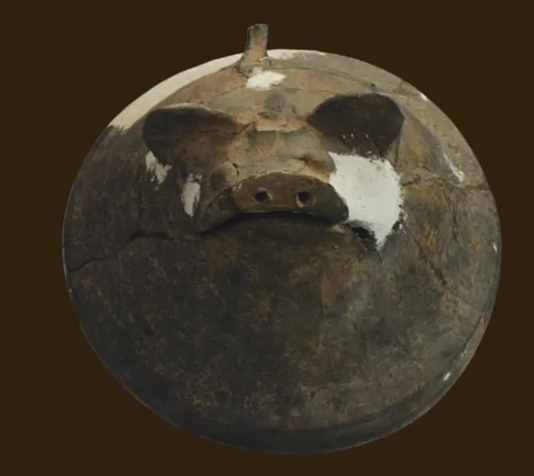 陶猪头盖,夏代,2000 年新密新砦遗址出土,郑州市文物考古研究院藏,高 18 厘米