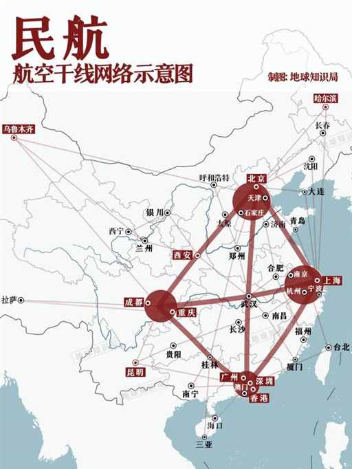 每个“金角”,再向外辐射出3条主通道,彼此交织,组成了国内的航空主干线网络。