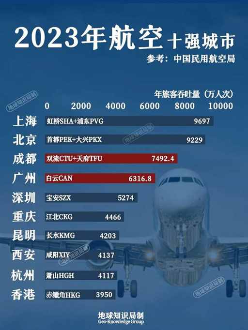 如果单独以机场客流量排名,白云国际机场已经连续四年全国第一,2020年还力压纽约伦敦东京巴黎,拿过世界第一。