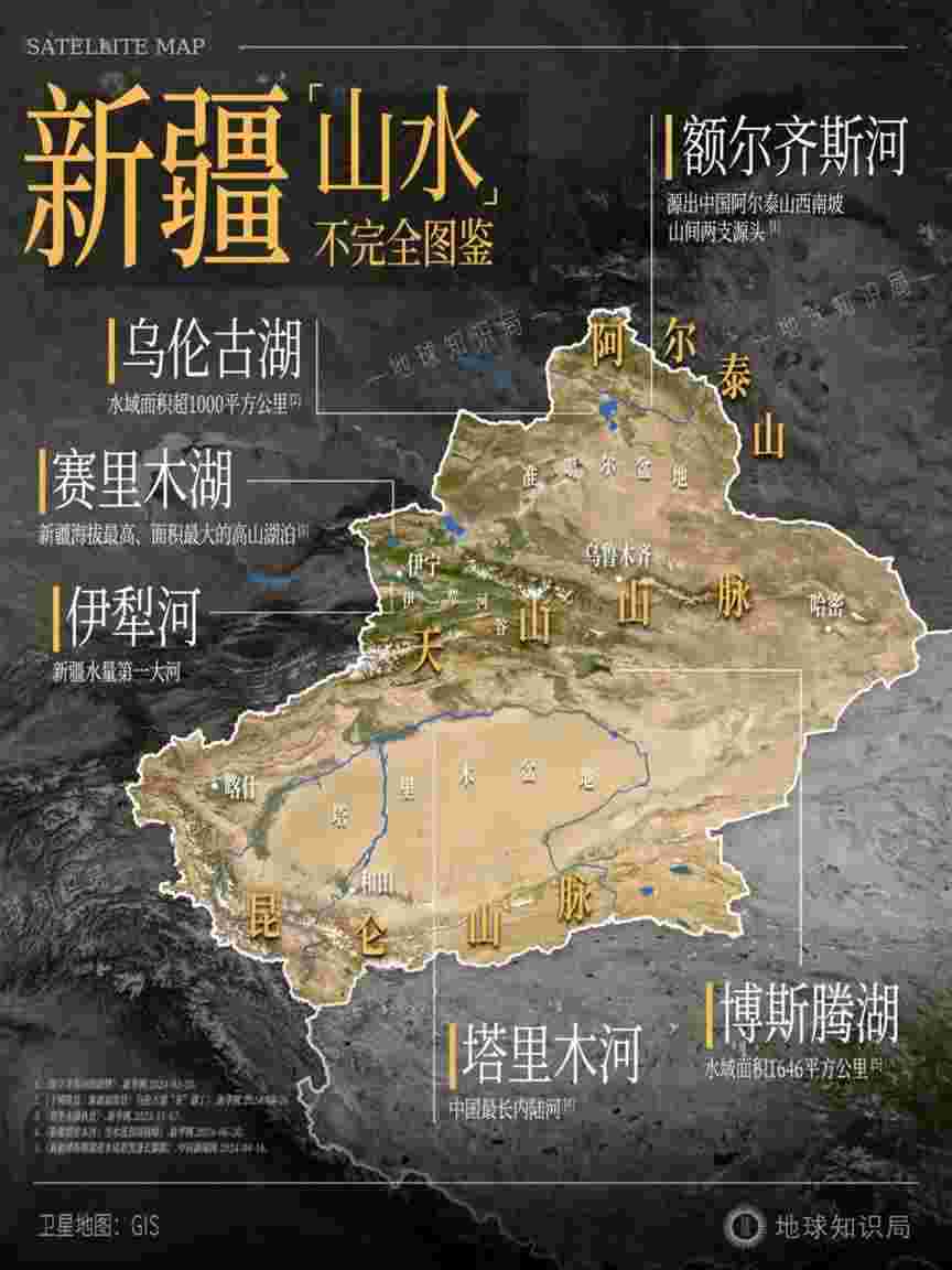 新疆是中国陆地面积最大的一个省份,具有“三山夹两盆”的独特地理特征,天山、阿尔泰山和昆仑山等山脉高耸,冰雪融化,形成了大量河流以及连片湖泊。