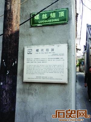 在巷子东入口处的墙上,有一块扬州文物局立的巷名介绍。介绍中称,“螺丝结顶”的意思为“地在缺口以内”,《扬州画舫录》记载,“螺丝结顶”是浴池之名,是因为这条巷子回旋曲折,就像螺蛳壳的纹路,而浴室正好在这条巷子的顶端,因而整条小巷也被命名为“螺丝结顶”巷。