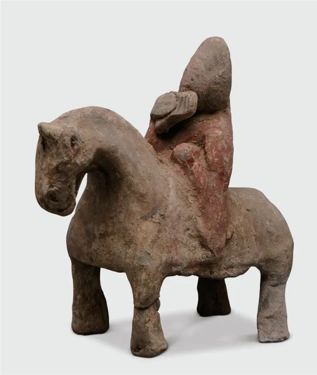 标本M2 : 41,骑俑头戴高髻顶风帽,帽帔覆耳齐颈。右手上举持排箫,置嘴边作吹奏状,左手握拳抱胸侧。骑俑袍服涂红彩,马体原似涂红彩,已脱落,鞍鞯涂白彩。马面、背上用黑彩描画出鬃毛、络头、攀胸、鞘带、鞦带、拔尘等马具装饰。通高16、马体长16.4厘米(图一四,5;图一七)。
