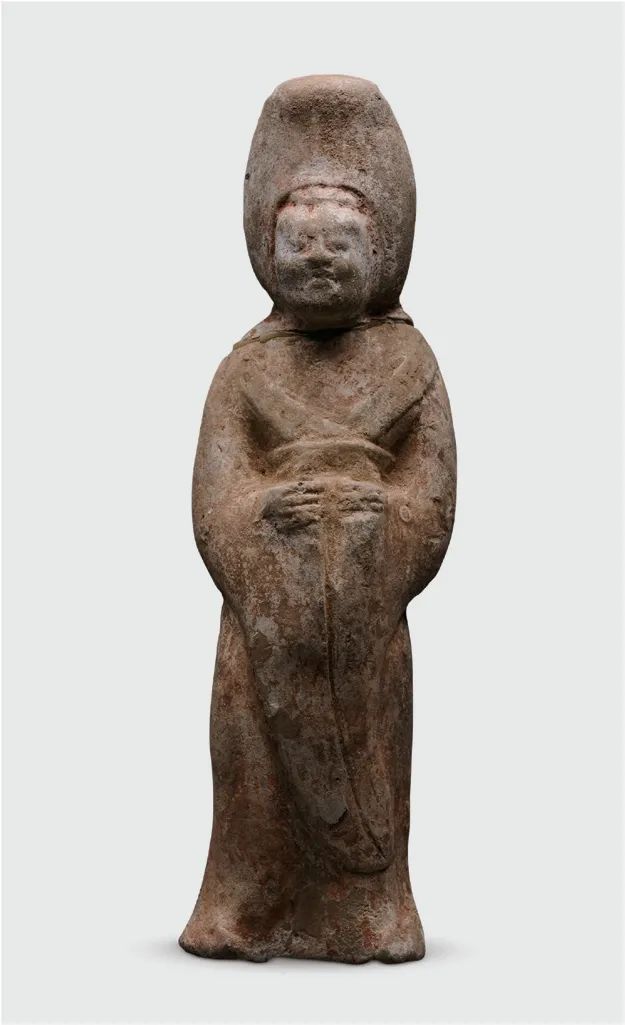 共2件。俑直立状,两脚八字形叉开。头梳扇形高髻,并用帕巾裹系,浓发上梳露耳挽于髻下。面相浑圆,宽额凹腮。上身穿低交领左衽阔长袖襦衫,领口加厚宽襴,半袒胸,胸系宽带抹胸。下裳穿高腰曳地长裙,鞋尖外露,形成马蹄形薄底座,脚穿尖首平底履。两臂自然下垂曲肘,双手隐袖内合揖于胸前。通体原涂白彩。标本M2 : 65,通高14.8厘米(图三二、三三)。