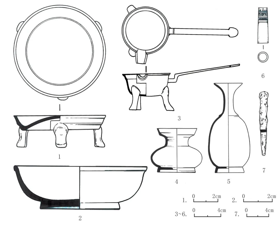 1.铜三足盘(M2:109) 2.铜钵(M2:106) 3.铜铛(M2:108) 4.铜壶(M2:105) 5.铜细颈瓶(M2:107)6.骨管状器(M2:104) 7.铁棺钉(M2:167)
