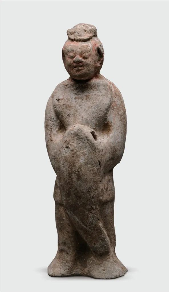 平帻俑 1件。标本M2 : 61,俑直立,仰头挺胸,双脚叉开。头戴矮髻顶平帻,头发上梳挽于帻下,面相浑圆,宽额头。上身外穿对襟阔短袖覆胯披衫,衫领加厚宽襕,内衬穿圆领窄袖覆胯襦衫,圆高领加厚,形成顿项,衫裾加宽襕紧裹臀部,肚腹圆鼓。下裳穿宽筒裤曳地,形成马蹄形薄底座,脚穿圆首平底履。右臂自然下垂,手握拳置腹侧,左臂下垂曲肘,手握拳上举置腋前,手心插孔已残,原持物已佚。俑通体原涂白彩地,面容、披衫再涂红色,红彩多已脱落。通高15.8厘米(图一八,3;图二九)。