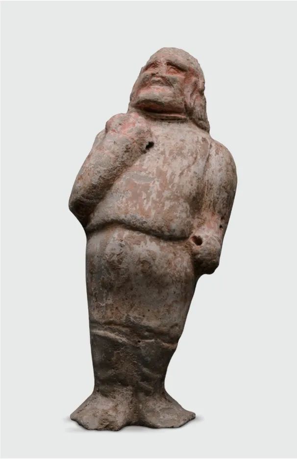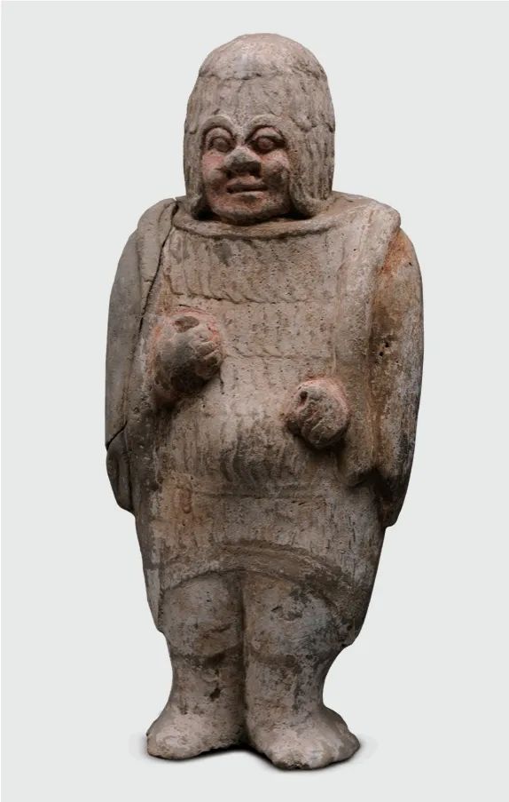 披发俑 1件。标本M2 : 157,俑直立后仰,双腿微叉。长发披肩,颧骨高凸,两腮深陷,两耳垂肩,张口作吆喝状。上身穿圆领窄袖及膝长衫,高圆领形成顿项,袖口加宽襴紧束,腰系窄带紧扎,腹部前凸。下裳筒裤,脚穿圆首平底高靿及膝长靴,靴中间两道棱箍,薄马蹄形底座。右臂下垂曲肘,手握拳上举胸前,手心有一穿透的斜插孔,左臂下垂置腹侧,手握拳,拳心亦有一穿透的斜插孔,双手持物已佚。俑通体施白彩。通高14厘米(图一八,6;图二一)。