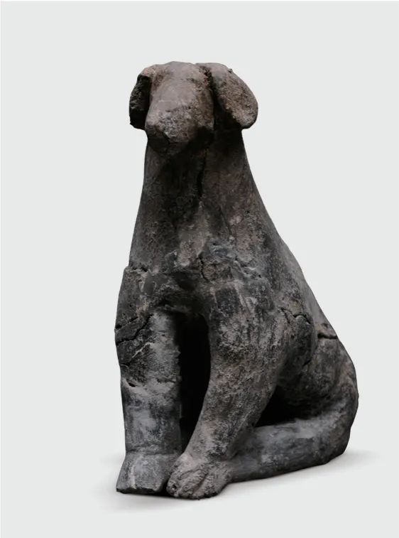 A型 1件。标本M2 : 57,狗作蹲坐状,粗长颈斜上挺,两耳下耷,两眼圆睁,尖锥状嘴紧闭。体肥,细长尾上翘卷曲贴臀。两前腿直斜撑,两后腿平前伸着地,四爪相扣。通体原涂白彩,已脱落。通高9.5、体长10.8厘米(图三六,1;图三八)。
