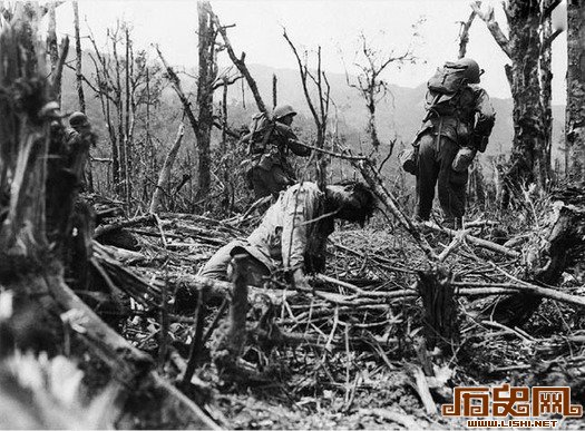 1945年4月12日,菲律宾吕宋岛北部,美军第25师的士兵们行军穿过巴勒特小道边缘的战地,路过一名倒毙在炸弹炸裂的树木上的日军士兵。