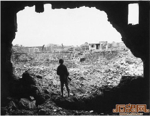 1945年6月13日,日本冲绳县那霸市,通过琉球首府一座剧院墙上的大洞,一名海军陆战队士兵看着美军轰炸的结果。这座战前拥有44.3万人口的城市只剩下支离破碎的建筑结构。