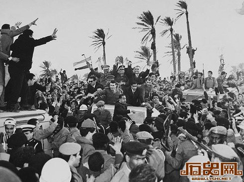 纳赛尔和卡扎菲于1969年12月纳赛尔访问利比亚期间在班加西体育场。