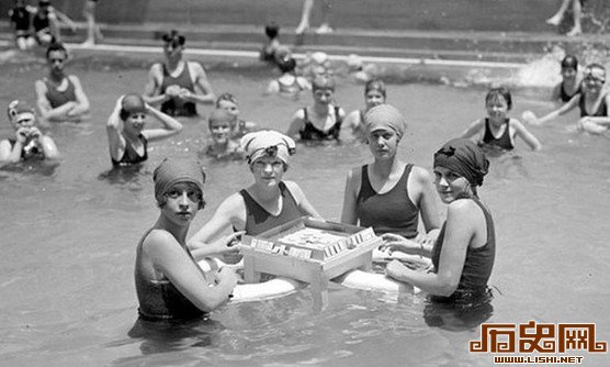 1924年,四名身穿泳衣、神态悠闲的美国女性在泳池里的浮桌上打麻将。