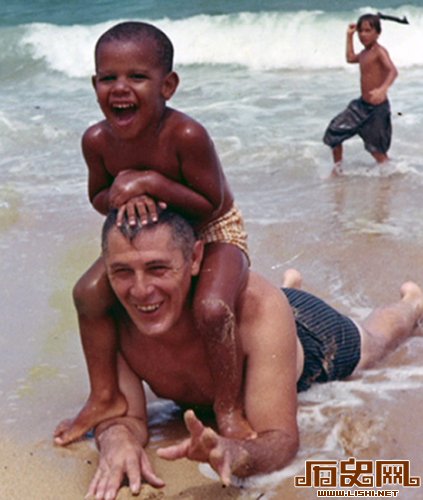幼年时期的美国民主党总统候选人奥巴马与外祖父在沙滩上玩耍,调皮的他骑在外祖父Stanley Armour Dunham的脖子上。