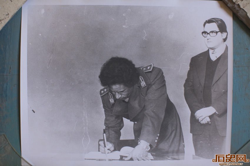 一次可能是对东欧的访问中,卡扎菲在签署文件,后面站着翻译