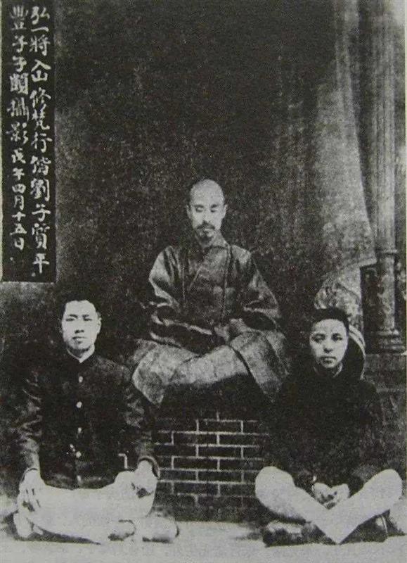 ▲1918年夏,弘一法师与弟子丰子恺(右)、刘质平(左)合影。