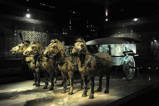 1980年,考古专家在秦始皇陵西侧发现了两辆大型彩绘铜车马,其为四匹马拉的马车,大小等于真车马的二分之一,驾具齐备,装饰华丽,铜马四肢粗大,威武雄壮,铜御俑造型逼真,神态恭谨。