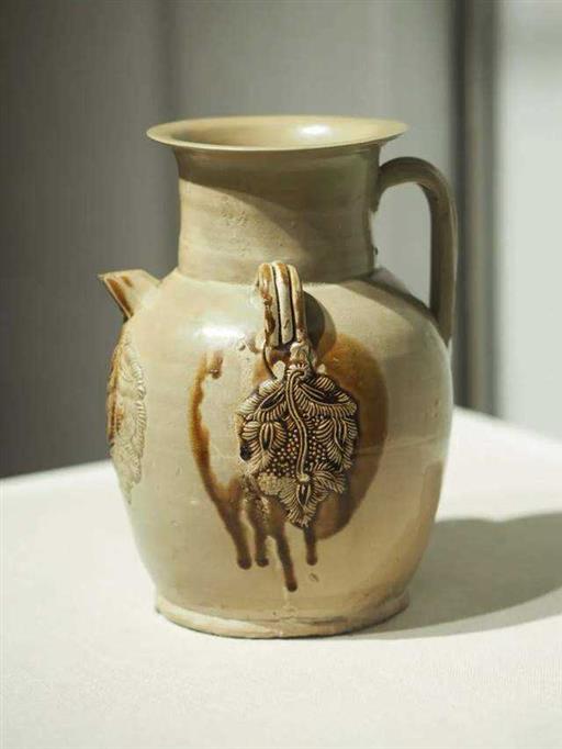 ▲唐长沙窑褐斑贴花椰枣纹执壶。图源/图虫创意©