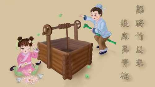 妾发初覆额,折花门前剧。郎骑竹马来,绕床弄青梅。同居长干里,两小无嫌猜,