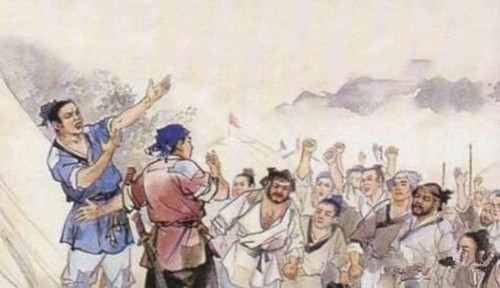 这些人走到大泽乡(安徽省宿县东南)时,赶上连日大雨,路被淹没,无法通行。他们只好停下等待,眼看着时间一天天过去了。