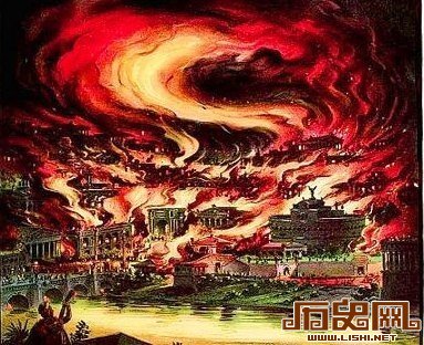 罗马大火:发生于公元64年7月18日,持续1天(一说是5天)。本图是一张艺术家想象的大火图。根据历史学家塔西陀的记忆(火灾时他九岁,住在罗马城内),大火起于古罗马竞技场附近的商店街。关于大火的起因,官方记载是意外失火,且起火后不久外出的皇帝尼禄便很快回到罗马城指挥救灾,塔西陀也认可这个说法。但民间一直传闻大火是残暴的尼禄的阴谋。