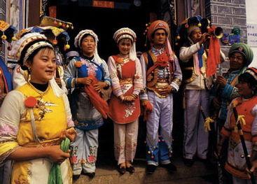 3、白族的起源具有多元的特点,最早的白族先民由洱海周边的土著昆明人、河蛮人与青藏高原南下的氐人、羌人融合形成,之后又融入了部分叟人、巂人、爨人、僰人、哀牢人、滇人、汉人等多种民族。在数千年的历史长河中,由于征战、拓土、商贸、屯垦、驻边等历史原因,白族才逐步形成当今白族之雏形。从明朝到1956年白族民族身份得到确立的几百年内,是白族大量汉化的过程。现代白族除了大理州外,从丘北的马者龙、昆明的西山、元江因远、楚雄南华、保山的旧寨、丽江相互之间呈不连续分布的事实也反映了这一点。