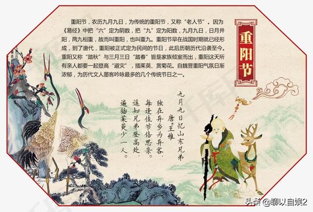 三国时魏文帝曹丕《九日与钟繇书》中曾这样描述当时的重阳节:“岁往月来,忽复九月九日。九为阳数,而日月并应,俗嘉其名,以为宜于长久,故以享宴高会。”