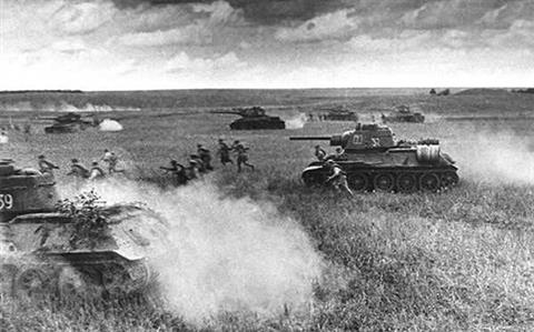 (上图)苏军坦克和步兵正在向一个村子发起突击。